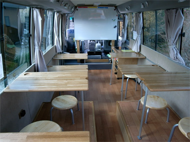| 〔移動式学習車 まんてんバスの外観〕 | 〔まんてんバスの車内・8名レッスン可能です〕 |